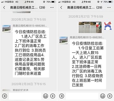 云翔機械復工復產(chǎn)后,每日的防疫安全定點到人,不容遺漏。從早晨進公司消毒各種場所,測量體溫,發(fā)放防疫用品,一日兩次巡查員工防疫安全措施的實施,每項工作記錄在冊。每日工作結束后,由防疫組組長胡慶菲抽樣檢查各種記錄,并做好每日防疫安全工作簡短總結,在員工群公示。復工后,云翔機械齒條齒輪訂單量足,全體員工遵循兩點間活動的生活工作軌跡,防疫復工兩手抓,企業(yè)復工運行有序。